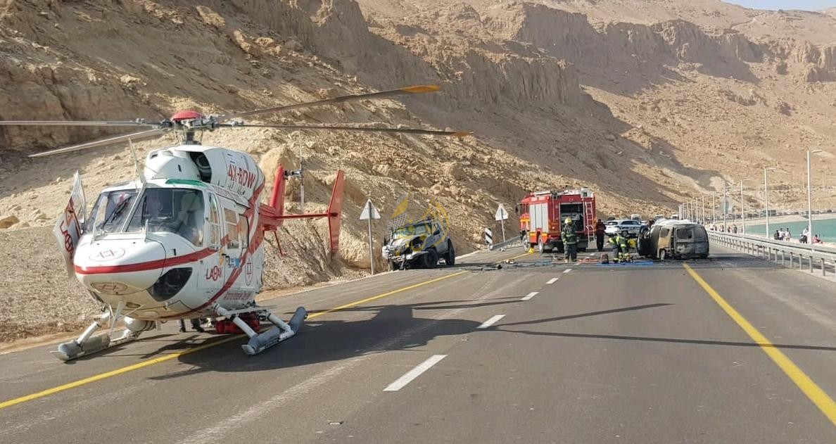 وأفادت مصادر في الإسعاف الإسرائيلي، أن حادث تصادم وجها لوجه وقع بين سيارتين على شارع رقم (90) من منطقة البحر الميت باتجاه عين جدي، وأدى ذلك إلى اشتعال النيران بإحدى السيارتين والتي تقل خمسة أشخاص بينهم ثلاثة أطفال، وجدوا فاقدين للوعي، ومن ثم أعلن الأطباء وفاتهم.