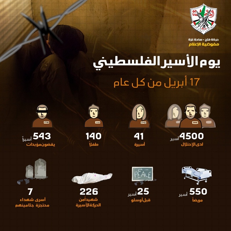 وتحل هذه الذكرى مع استمرار سلطات الاحتلال الإسرائيلي اعتقال قرابة 4500 أسير، بينهم 41 أسيرة، و140 طفلا، كما أن هناك 550 أسيرًا يعانون من أمراض بدرجات مختلفة، وهم بحاجة إلى متابعة ورعاية صحية حثيثة، وعلى الأقل هناك عشرة أسرى مصابون بالسرطان، وبأورام بدرجات متفاوتة، من بينهم الأسير فؤاد الشوبكي (82 عاما)، وهو أكبر الأسرى سنّا.