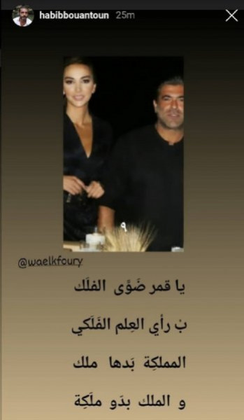 بيروت: شارك الشاعر اللبناني حبيب أبو أنطون صديق الفنان اللبناني وائل كفوري، جمهوره، بصورة تجمع الأخير بفتاة وذلك عبر خاصية ستوري على تطبيق تبادل الصور انستغرام، وعلّق عليها: "يا قمر ضوّي الفلك، برأي العِلم الفلكي، المملكة بدها ملك والملك بدو ملكة".