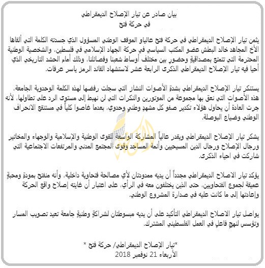 وفيما يلي نص بيان تيار الإصلاح الديمقراطي في حركة فتح: