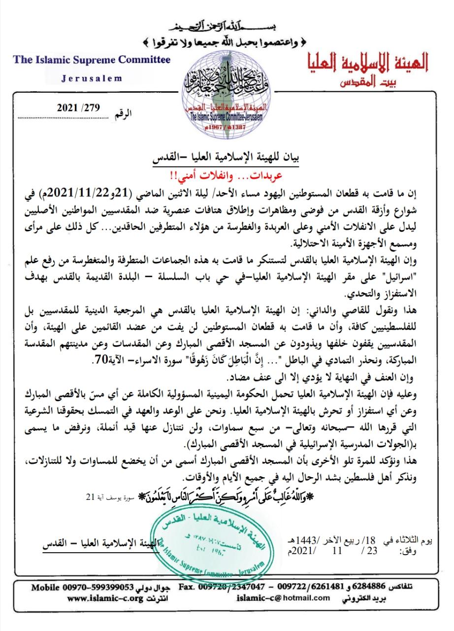 الهيئة الإسلامية العليا تستنكر اعتداءات المستوطنين على المقدسيين