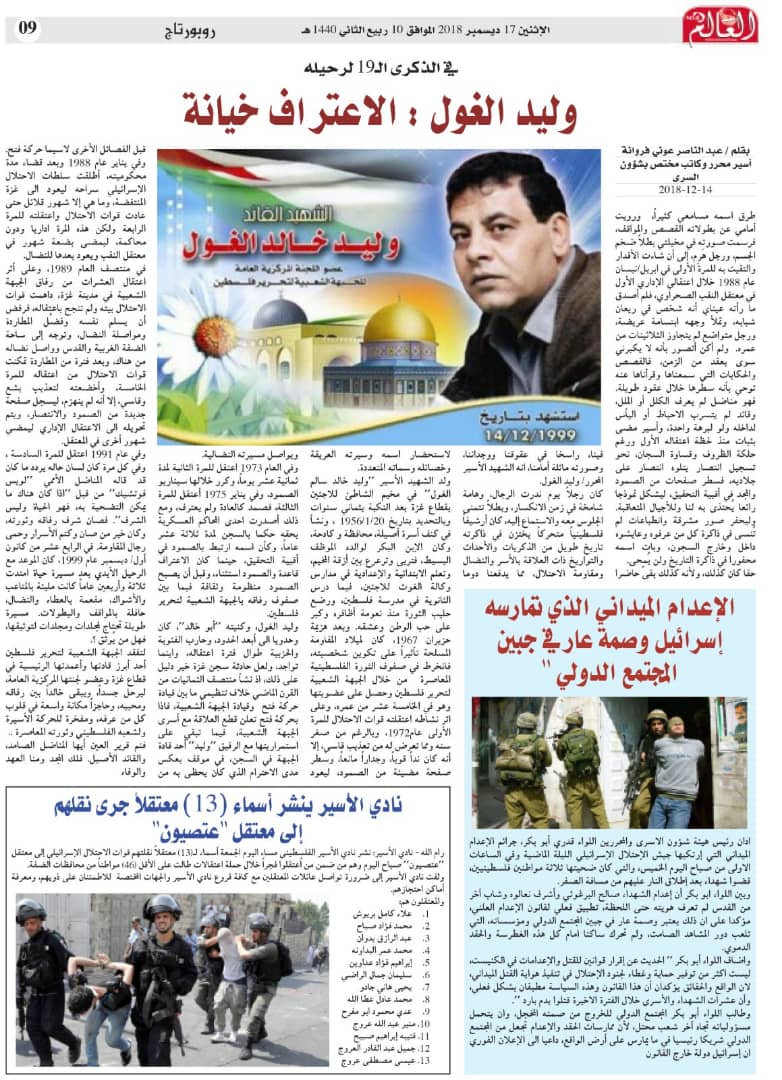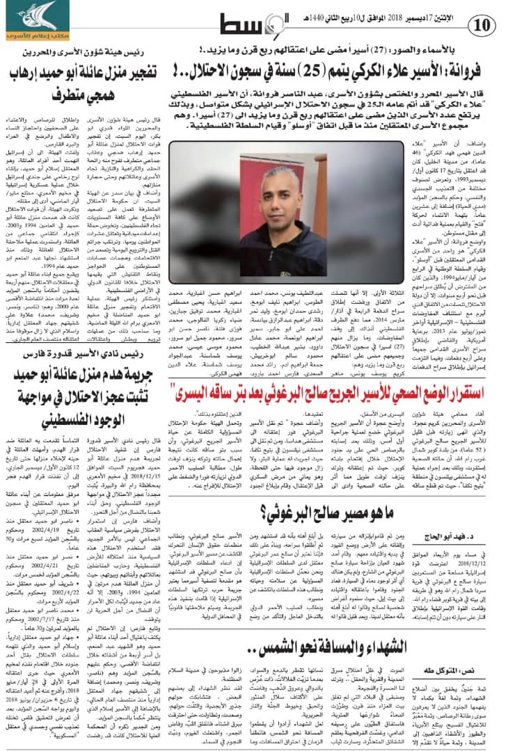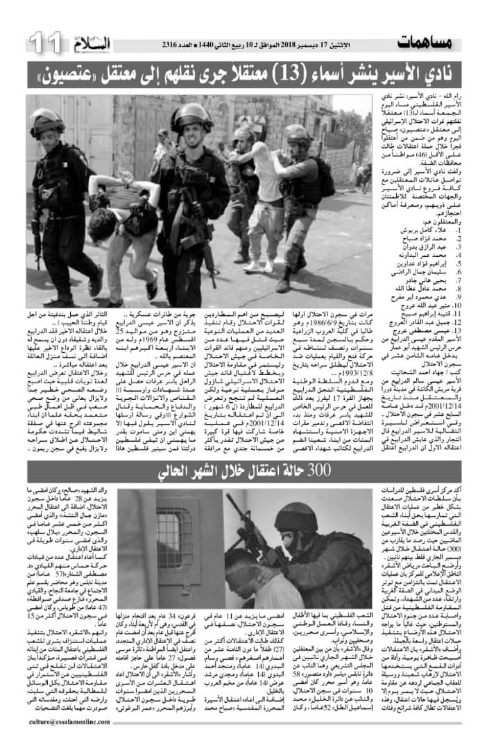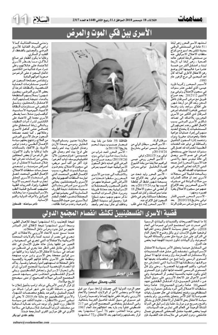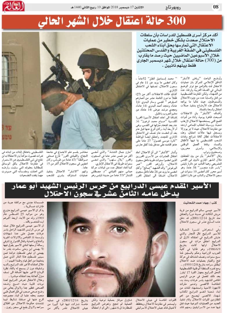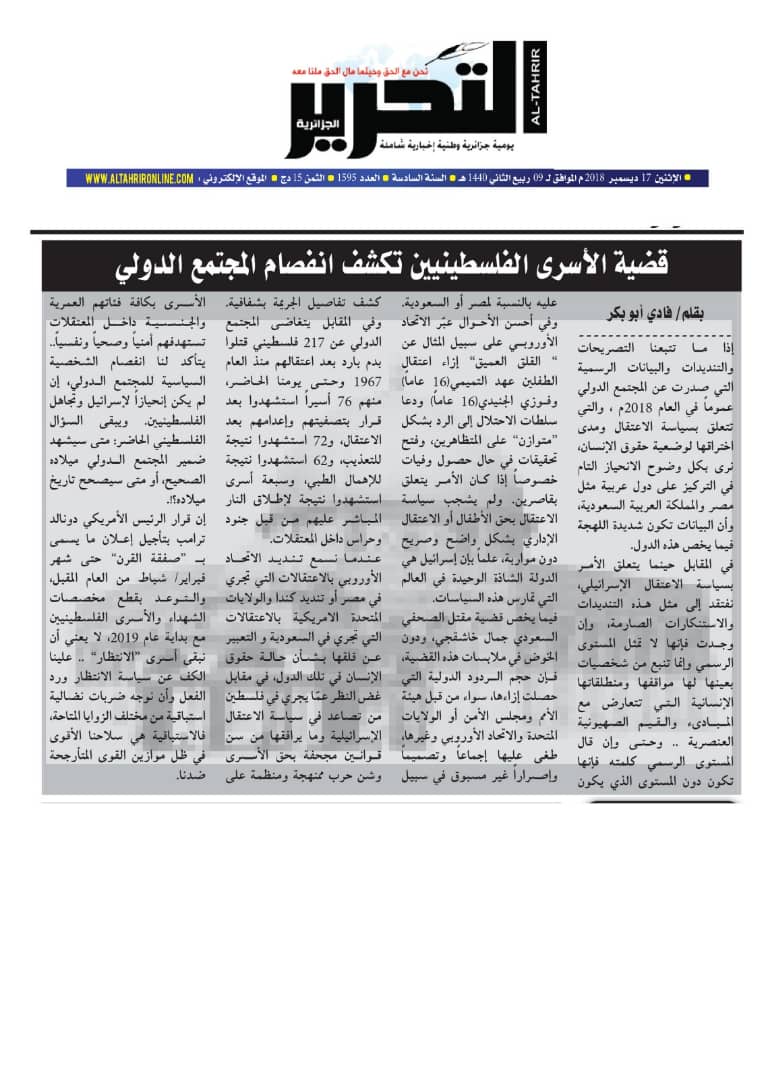 الجزائر: نشرت السفارة الفلسطينية في الجزائر، تقريرًا، اليوم الأربعاء،رصدت خلاله، تناول الصحافة الجزائرية، لأوضاع الأسرى الفلسطينيين فى سجون الأحتلال الإسرائيلي، وحول سياسة الاعتقالات التعسفية اليومية التى يقوم بها فى الاراضى الفلسطينية المحتلة .