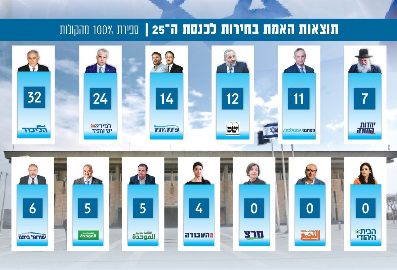 وتراجعت قوة معسكر زعيم اليمين الإسرائيلي، بنيامين نتنياهو، إلى 64 مقعدا في الكنيست الـ25، بحسب ما أظهرت النتائج النهائية بعد فرز 100% من الأصوات، في حين أظهرت النتائج أن حزب «ميرتس» فشل نهائيًا في تجاوز نسبة الحسم وبات خارج البرلمان الإسرائيلي.
