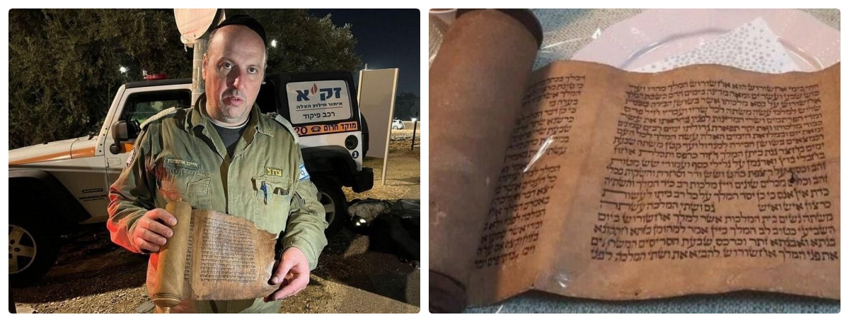 ونشرت الصحيفة صورا لرجل قالت إنه الرائد حاييم أوتمازجين، وهو متطوع في منظمة البحث والإنقاذ الإسرائيلية "زاكا"، ظهر فيها وبيده لفائف من المخطوطات.