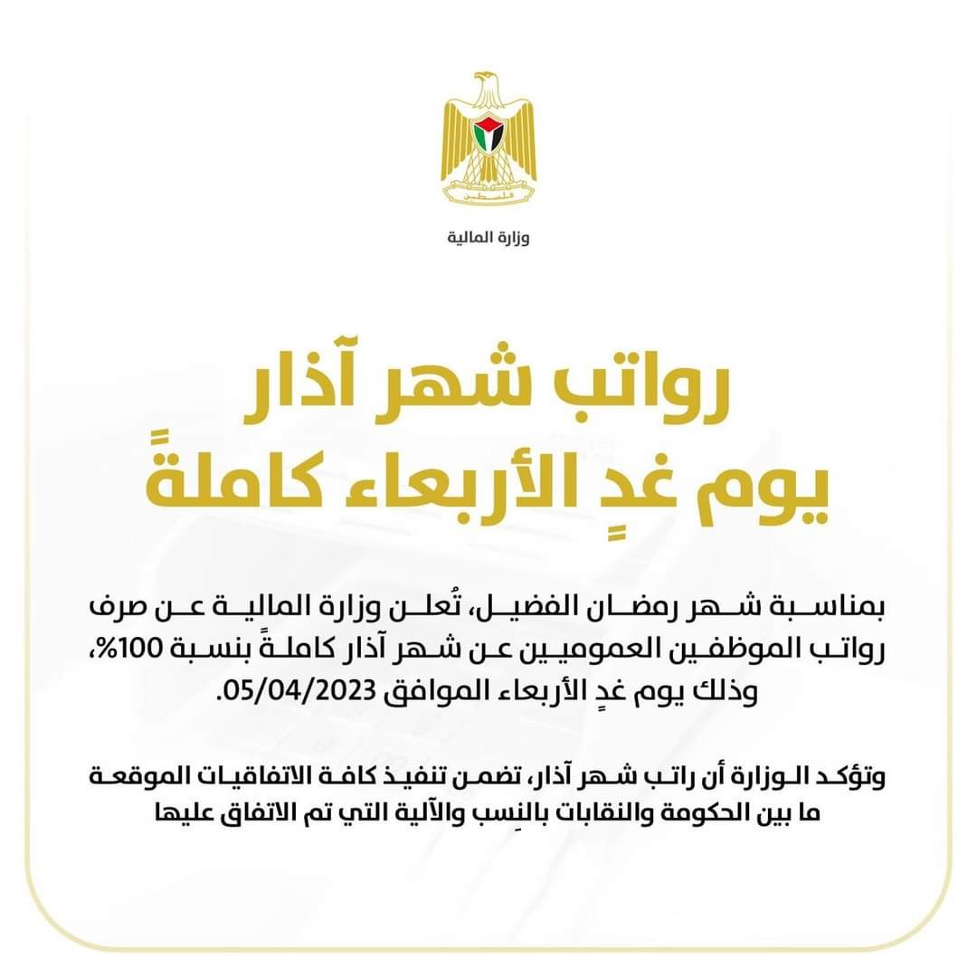 وقالت المالية في بيان لها، إنه بمناسبة شهر رمضان الفضيل، تعلن الوزارة عن صرف رواتب الموظفين العموميين عن شهر آذار كاملة بنسبة 100%، وذلك يوم غدِ الأربعاء الموافق 05/04/2023م.