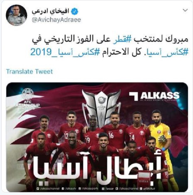 ونشر أفيخاى أدرعى، صورة لمنتخب قطر عبر حسابه الرسمي على موقع التغريدات القصيرة "تويتر"، وعلق قائلاً: "مبروك لمنتخب قطر على الفوز التاريخى فى كأس آسيا، كل الاحترام كأس آسيا 2019."