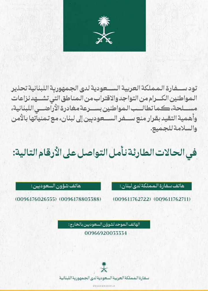 وأطلقت سفارة المملكة العربية السعودية في لبنان تحذيراً لمواطنيها من الاقتراب أو التواجد في مناطق تشهد نزاعات مسلحة، وطالبت في بيان لها المواطنين بمغادرة الأراضي اللبنانية على وجه السرعة وفوراً.