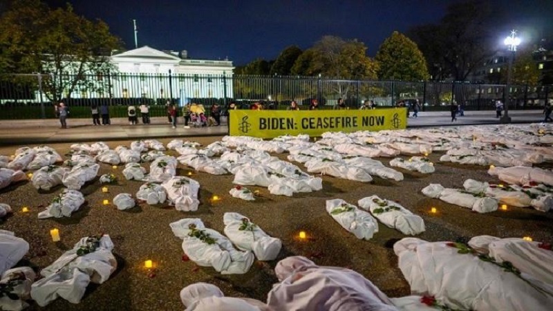 ووضع موظفو "العفو الدولية"، أكاليل من الزهور على أكفان، ووجهوا دعوة للرئيس الأميركي جو بايدن للضغط من أجل وقف الحرب العدوانية على قطاع غزة.