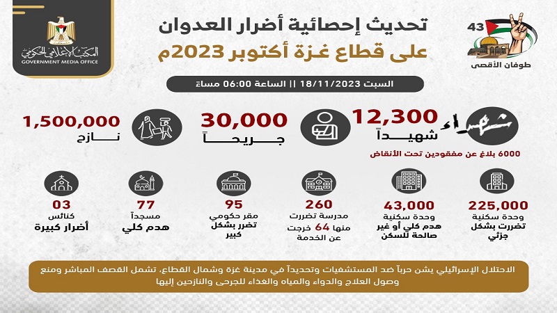 الإعلام الحكومي: 12300 شهيد وأكثر من 30 ألف مصاب منذ بدء العدوان على غزة