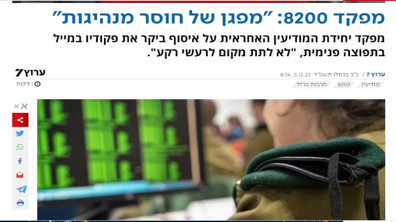 ذكرت القناة السابعة العبرية أن قائد الوحدة 8200، التابعة لشعبة الاستخبارات في جيش الاحتلال العميد "ي"، بعث برسالة لاذعة عبر البريد الإلكتروني إلى مرؤوسيه انتقد فيها بشدة تسريبات ما حدث في الوحدة قبل وبعد هجوم عناصر المقاومة في 7 أكتوبر، وذلك بعد توجيه اتهامات للوحدة بالإهمال في عدم اتخاذ المعلومات الواردة على محمل الجد.