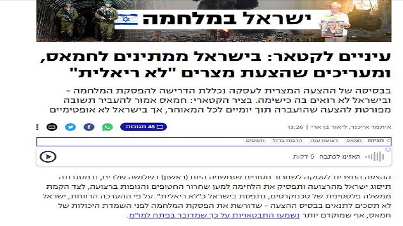 وأضافت الصحيفة، أنه في إسرائيل ينتظرون جواباً مفصلاً من حماس على الاقتراح الذي أرسل عبر قطر، وقد يصل خلال يومين على الأكثر.