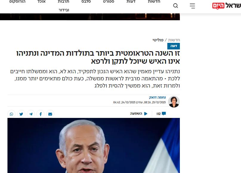 ذكرت الكاتبة والمحللة الإسرائيلية نحما دوفيك، أن العام 2023 الذي شارف على الانتهاء هو العام الأسوأ في تاريخ إسرائيل.