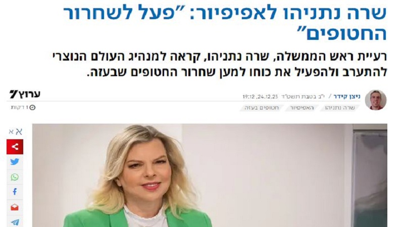 ترجمة للكوفية: بعد إرسال رسائل رسمية إلى 33 قائدة نسائية حول العالم، على رأسهن زوجة الرئيس الأمريكي جو بايدن، وزوجتي زعيمي بريطانيا وفرنسا، وجهت زوجة رئيس الوزراء في حكومة الاحتلال سارة نتنياهو، رسالة رسمية إلى بابا الفاتيكان البابا فرنسيس، طلبت فيها مساعدته في جهود إعادة الأسرى الإسرائيليين من غزة.