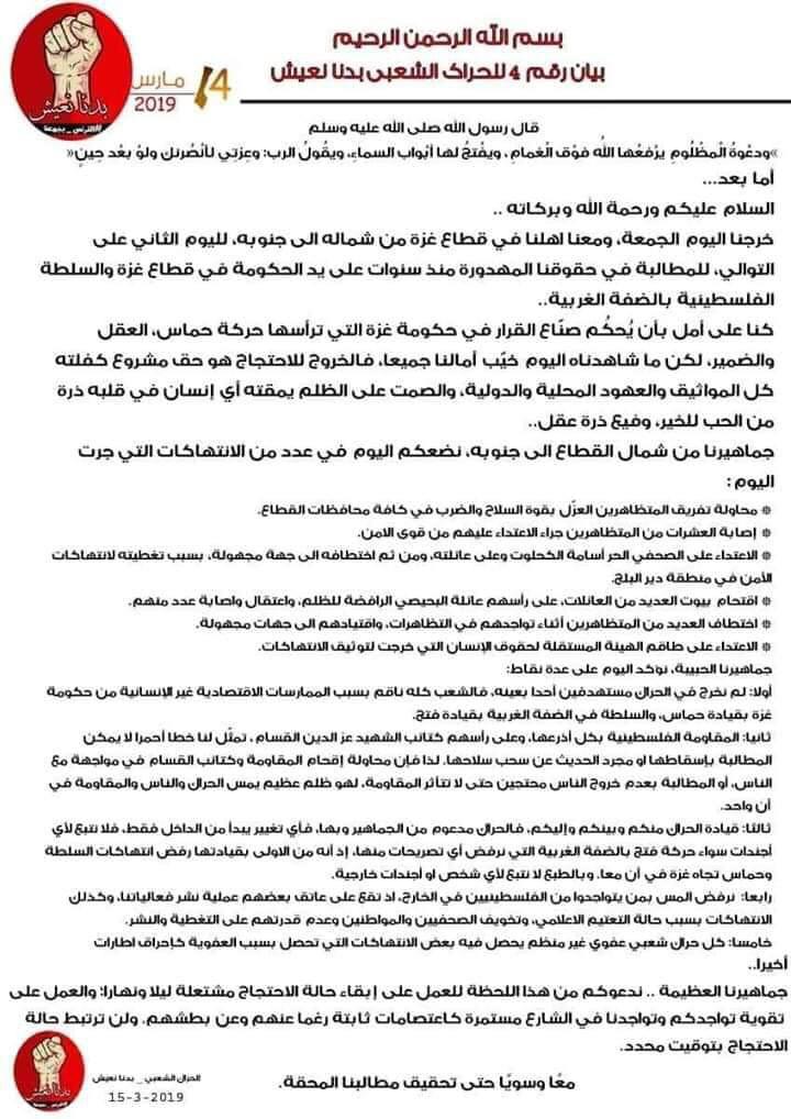 وأكد الحراك في بيانه الرابع، مساء اليوم الجمعة، أنهم خرجوا اليوم ومعهم أهلنا في قطاع غزة من شماله إلى جنوبه لليوم الثاني على التولي للمطالبة بحقوقه المهدورة منذ سنوات على يد الحكومة في قطاع غزة والسلطة الفلسطينية بالضفة الغربية.