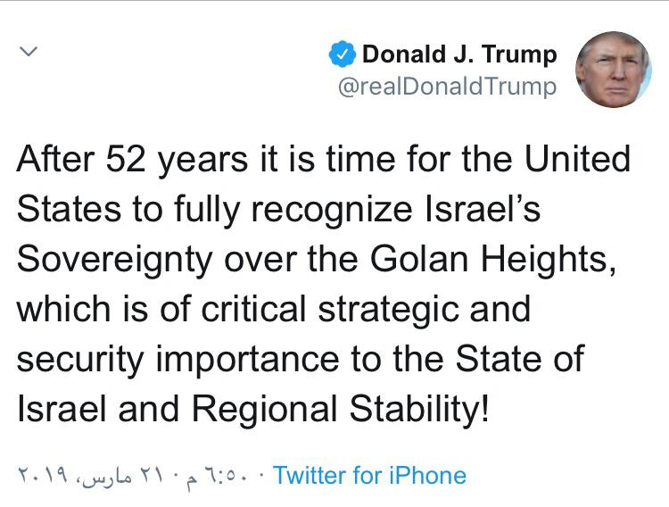 وكتب ترامب في تغريدة على تويتر يقول: "بعد 52 عاما، حان الوقت لاعتراف الولايات المتحدة الكامل بسيادة إسرائيل على هضبة الجولان التي لها أهمية إستراتيجية وأمنية حيوية لدولة إسرائيل والاستقرار الإقليمي!".