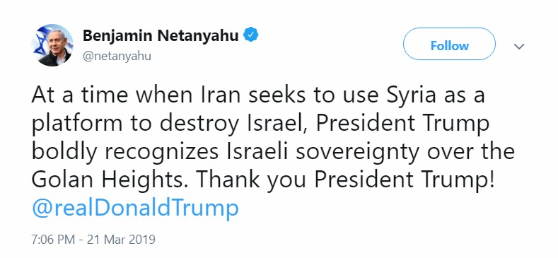 وقال نتنياهو، في تغريدة نشرها على حسابه الرسمي في موقع "تويتر"، بعد دقائق من تصريح سيد البيت الأبيض: "في الوقت الذي تسعى فيه إيران إلى استخدام سوريا كموطئ قدم لتدمير إسرائيل يعترف الرئيس ترامب بشجاعة بسيادة إسرائيل على مرتفعات الجولان. شكرا لك السيد الرئيس!".