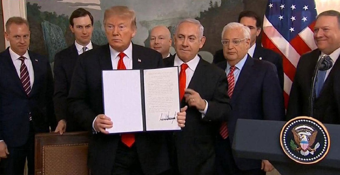 متابعات: أصدر الرئيس الأمريكي دونالد ترامب تعليماته لجميع الوكالات الأمريكية بضمنها الوزارات والمؤسسات الحكومية لتتخذ الخطوات اللازمة لتطبيق قراره الاعتراف بالسيادة الإسرائيلية على هضبة الجولان.