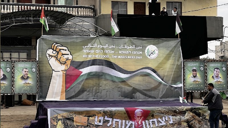 ورفعت كتائب القسام لافتة "نحن الطوفان… نحن اليوم التالي" على منصة تسليم الأسرى الإسرائيليين بثلاث لغات العربية والعبرية والانجليزية.