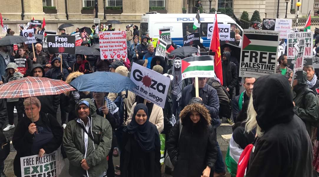 وتجمهر المتظاهرون أمام مبنى هيئة الإذاعة البريطانية (BBC)، وتوجهوا بعد ذلك إلى مقر الحكومة البريطانية، وعقدوا مهرجانًا خطابيًا شارك فيه عشرات المتحدثين من المنظمات التضامنية والنقابات المهنية ومن اعضاء مجلس العموم البريطاني.