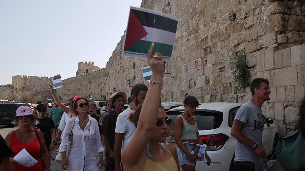 مظاهرة مؤيدة لفلسطين تستقبل سفينة سياح إسرائيليين في رودوس اليونانية