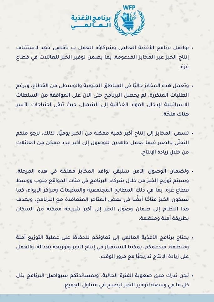 الكوفية متابعات: أصدر برنامج الأغذية العالمي في قطاع غزة ، اليوم الأحد، بياناً صحفياً بشأن عمل المخابز في قطاع غزة.