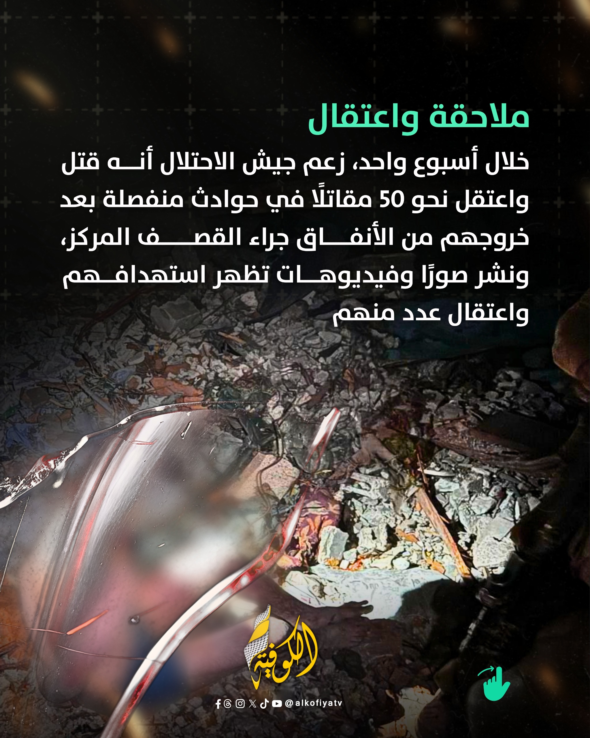 خلال أسبوع واحد، زعم جيش الاحتلال أنه قتل واعتقل نحو 50 مقاتلًا في حوادث منفصلة بعد خروجهم من الأنفاق جراء القصف المركز، ونشر صورًا وفيديوهات تظهر استهدافهم واعتقال عدد منهم.