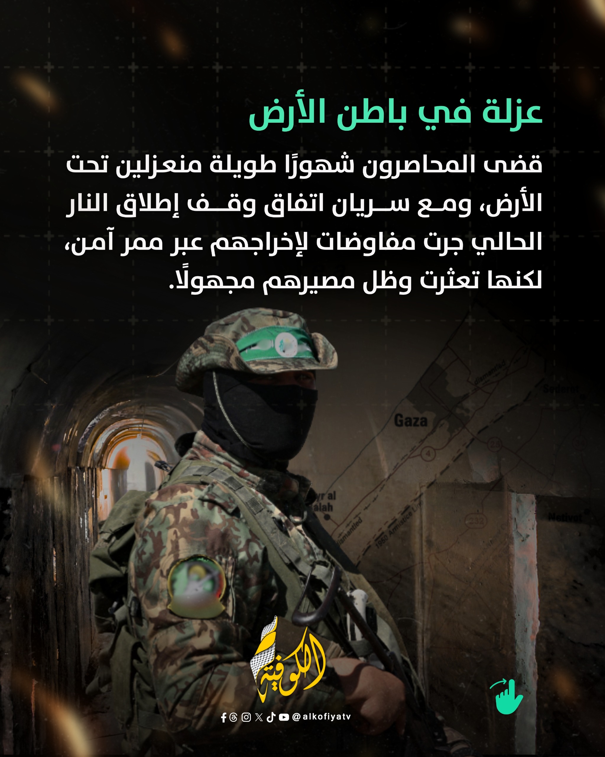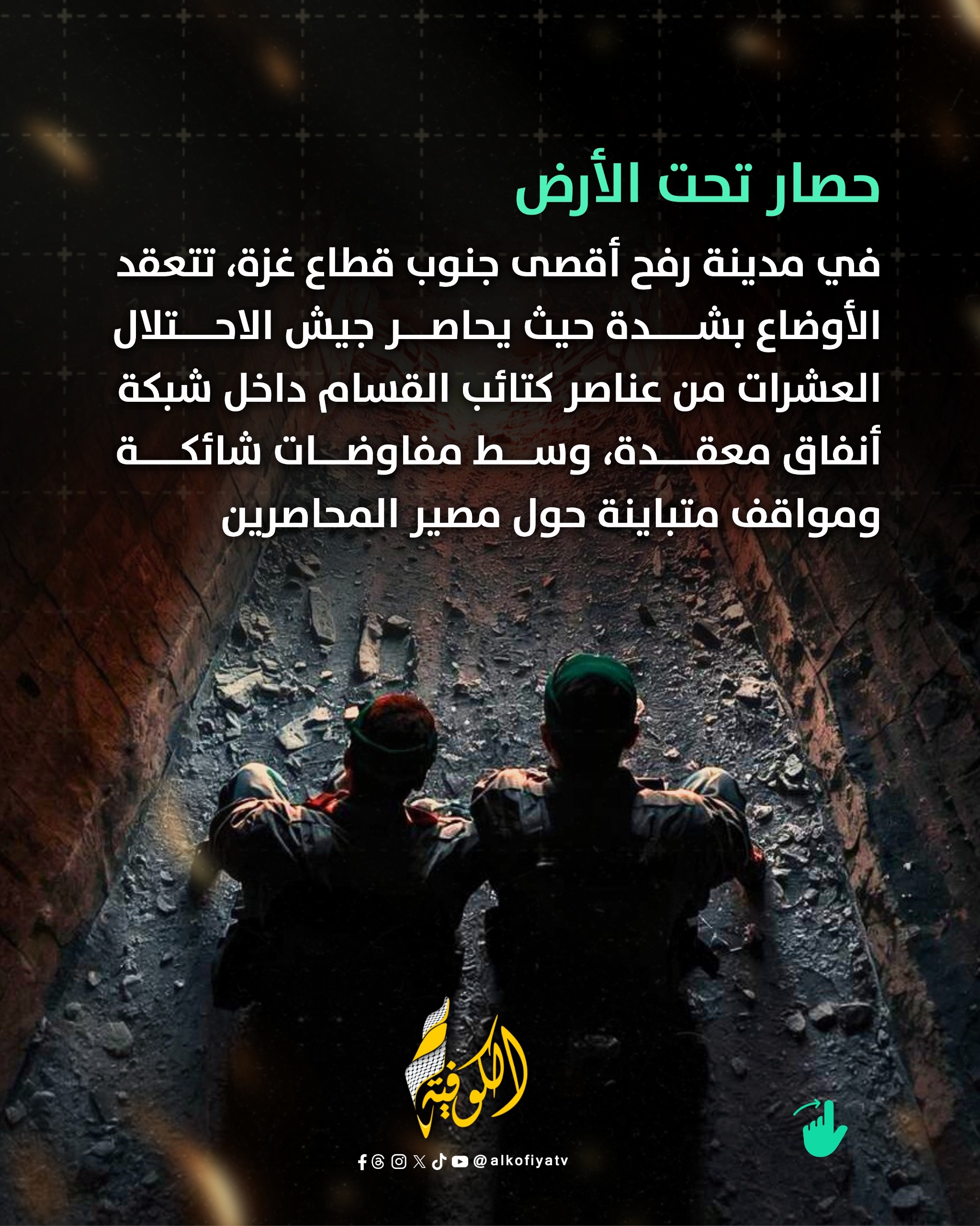 الكوفية لا تزال قضية عناصر كتائب القسام المحاصرين في باطن الأرض بالمناطق الشرقية لمدينة رفح أقصى جنوب قطاع غزة تتصدر المشهد، حيث تتعقد الأوضاع بشدة في ظل الحصار المطبق الذي يفرضه جيش الاحتلال على العشرات من عناصر كتائب القسام داخل شبكة أنفاق معقدة، وسط مفاوضات شائكة ومواقف متباينة حول مصير المحاصرين.