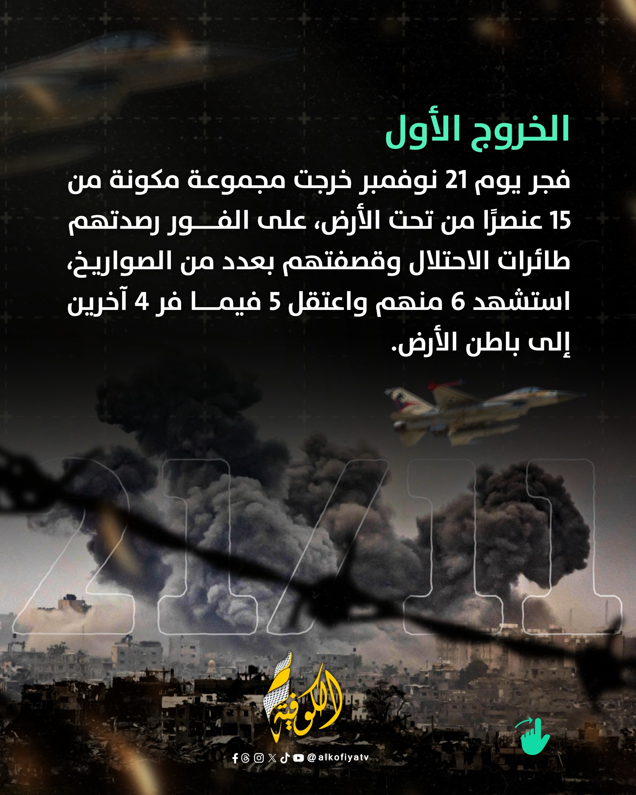 فجر يوم 21 نوفمبر 2025 خرجت مجموعة مكونة من 15 عنصرًا من تحت الأرض، على الفور رصدتهم طائرات الاحتلال وقصفتهم بعدد من الصواريخ، استشهد 6 منهم واعتقل 5 فيما فر 4 آخرين إلى باطن الأرض.