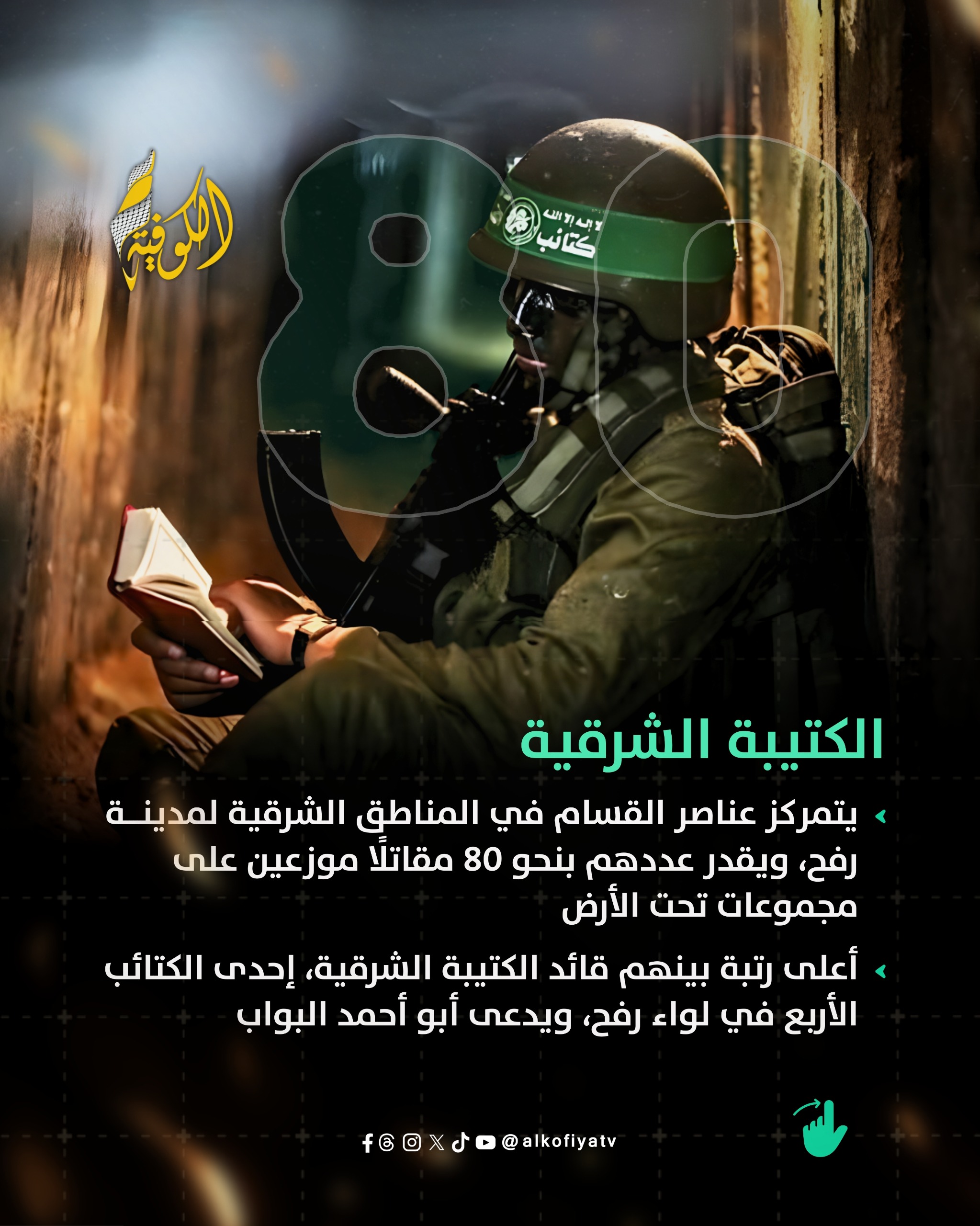 يتمركز عناصر القسام في المناطق الشرقية لمدينة رفح وهي من ضمن المناطق التي تخضع لسيطرة الاحتلال وفق اتفاق وقف إطلاق النار الأخير، ويقدر عددهم بنحو 80 مقاتلًا موزعين على مجموعات تحت الأرض، أعلى رتبة بينهم قائد الكتيبة الشرقية، إحدى الكتائب الأربع في لواء رفح، ويدعى أبو أحمد البواب، يرافقه نائبه وعضو المجلس القيادي للكتيبة الشرقية.