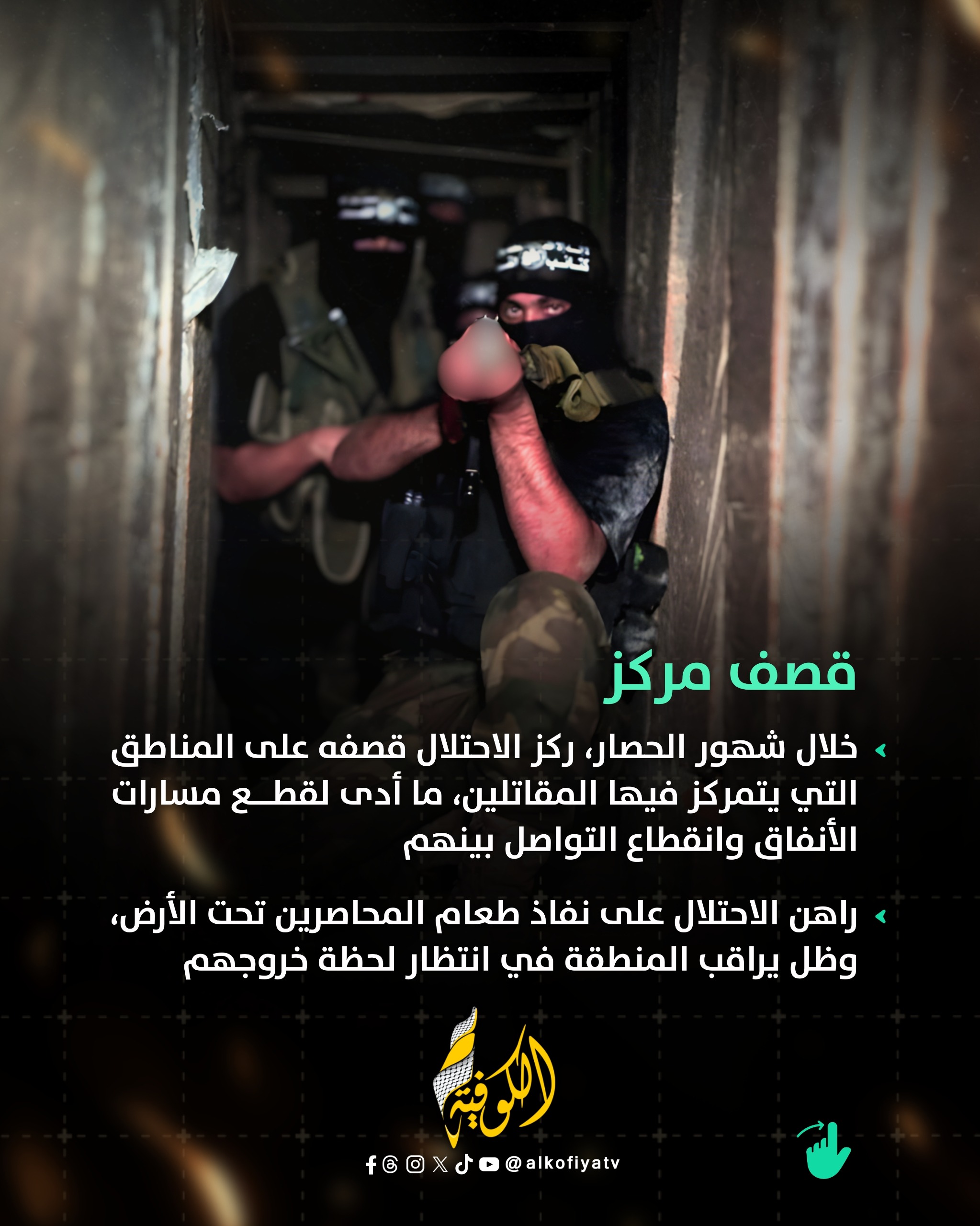 قضى المحاصرون شهورًا طويلة منعزلين تحت الأرض، في ظروف حصار وقصف وتجويع، ومن دون مأوى أو دعم، وبأدنى الإمكانات التي تكاد تبقي الإنسان على قيد الحياة، بينما واجهوا الاحتلال بإرادة لم تنكسر، ودافعوا عن الأرض والعرض، وسطروا "ملحمة البطولة والعزة بدمائهم".