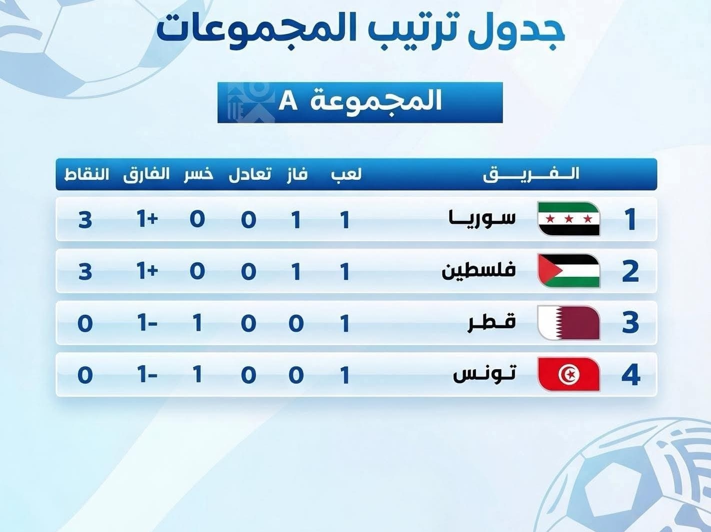 ويتصدر منتخب فلسطين جدول ترتيب المجموعة الأولى، برصيد 3 نقاط، بالتساوي مع المنتخب السوري، ثم تأتي قطر وتونس في المركزين الثالث والرابع بدون نقاط.
