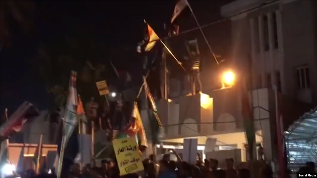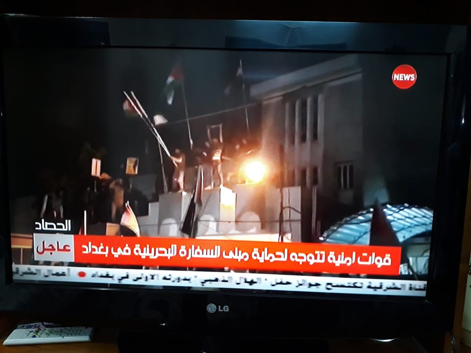 بغداد: اقتحم المئات من المتظاهرين العراقيين، مساء اليوم الخميس، مقر "سفارة المملكة البحرينية" في العاصمة العراقية بغداد، ورفعوا العلمين العراقي والفلسطيني بعد إزالة العلم البحريني عن مقر السفارة.