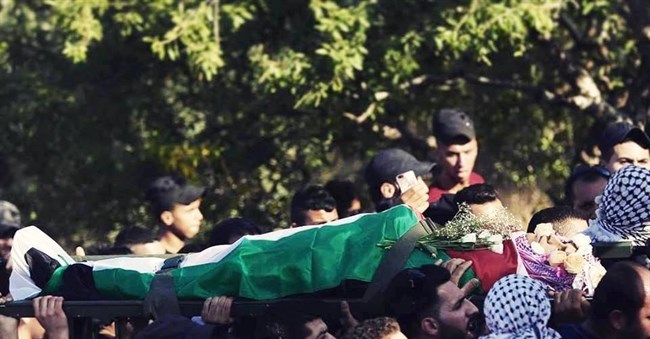 رام الله: شيع أهالي قرية النبي صالح، اليوم الأربعاء، جثمان الشهيد عز عبد الحفيظ التميمي (21 عاماً)، إلى مثواه الأخير في مسقط رأسه قرية النبي صالح شمال مدينة رام الله.