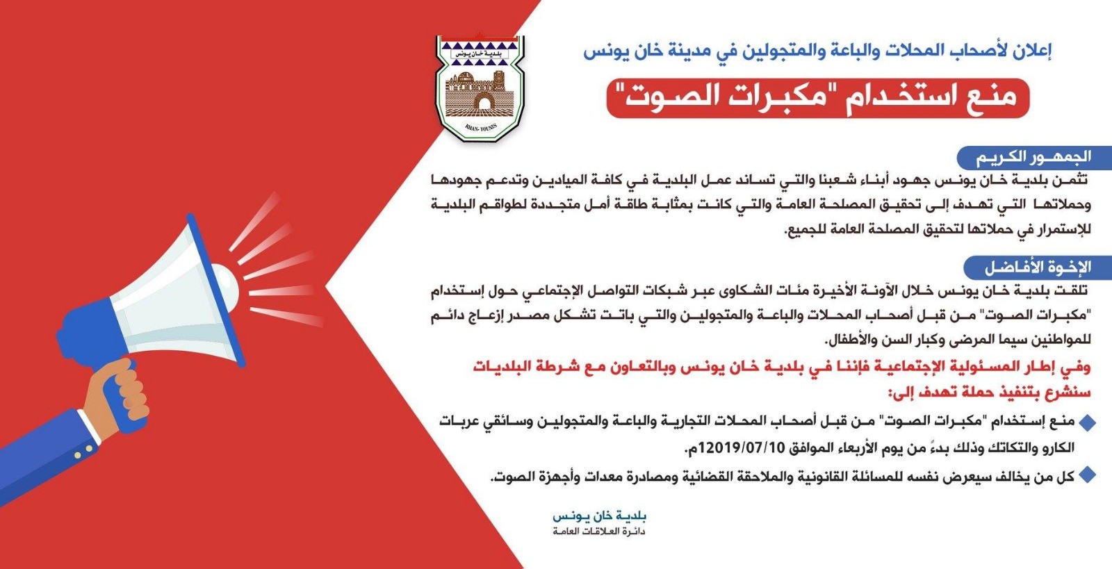 وأوضحت، "في إطار المسؤولية الاجتماعية، فإننا في بلدية خان يونس وبالتعاون مع شرطة البلديات سنشرع بتنفيذ حملة تهدف إلى منع استخدام مكبرات الصوت، من قبل أصحاب المحلات التجارية والباعة المتجولين وسائقي عربات الكارو والتكاتك بدءً من يوم الأربعاء 2019-7-10".