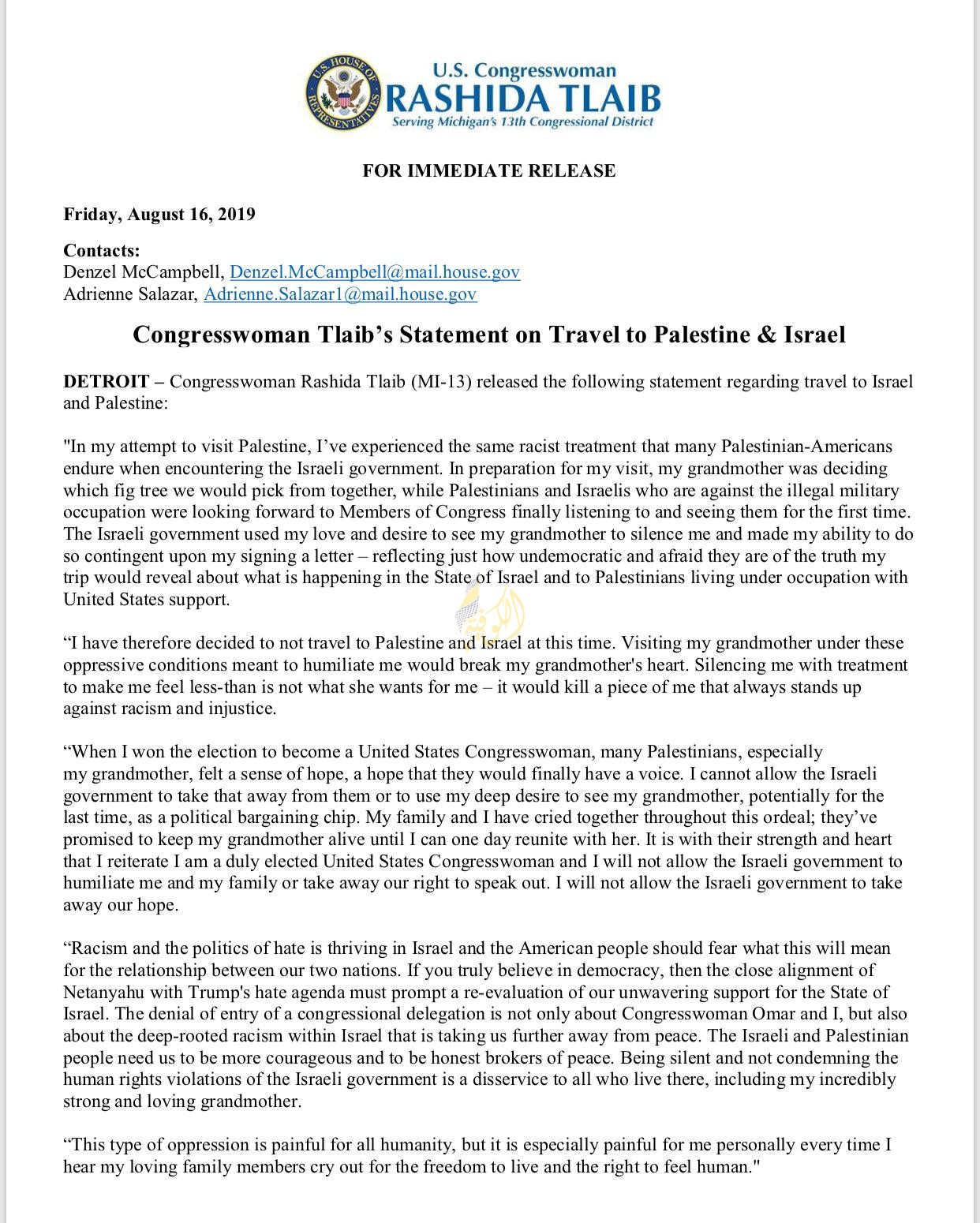 وشددت على أن حرمان وفد من الكونغرس من الدخول لا يتعلق فقط بي وبالنائبة إلهان عمر، ولكن أيضًا حول العنصرية العميقة الجذور داخل إسرائيل التي تأخذنا بعيدًا جدا عن السلام.. يحتاج الشعبان الإسرائيلي والفلسطيني إلى أن يكونا أكثر شجاعة وأن يكونا وسطاء سلام صادقين.. إن الصمت وعدم إدانة انتهاكات حقوق الإنسان التي ترتكبها الحكومة الإسرائيلية هو ضرر لكل من يعيش هناك، بما في ذلك جدتي القوية والمحبة بشكل لا يصدق.