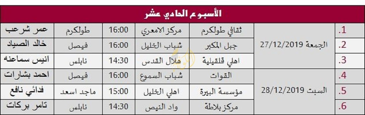القدس المحتلة: أعلن الاتحاد الفلسطيني لكرة القدم، اليوم الإثنين، عن جدول مباريات الأسبوع الحادي عشر من دوري المحترفين، وذلك على النحو الآتي: