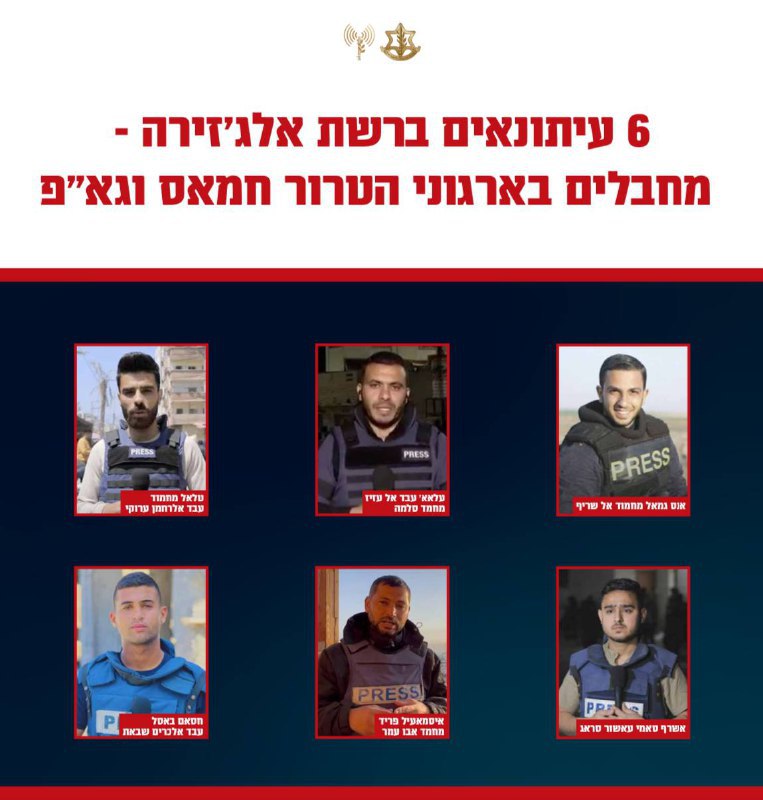 وقال: هؤلاء الصحفيون يشكلون “رأس الحربة” في نشر رسائل حماس الدعائية في إطار عملهم بقناة الجزيرة وخاصة من منطقة شمال قطاع غزة.