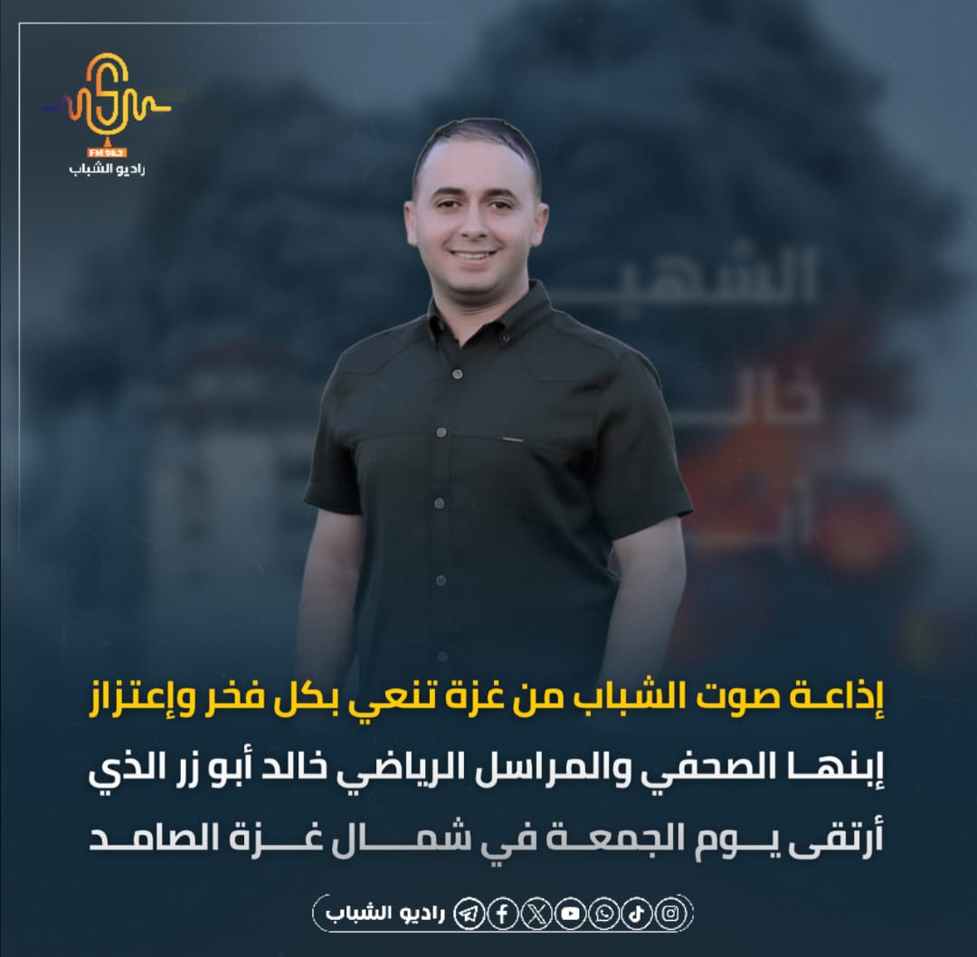 استشهد الزميل الصحفي في راديو الشباب، الشهيد  المراسل الرياضي / خالد أبو زر  جراء استهداف منزله في شمال قطاع غزة اليوم.