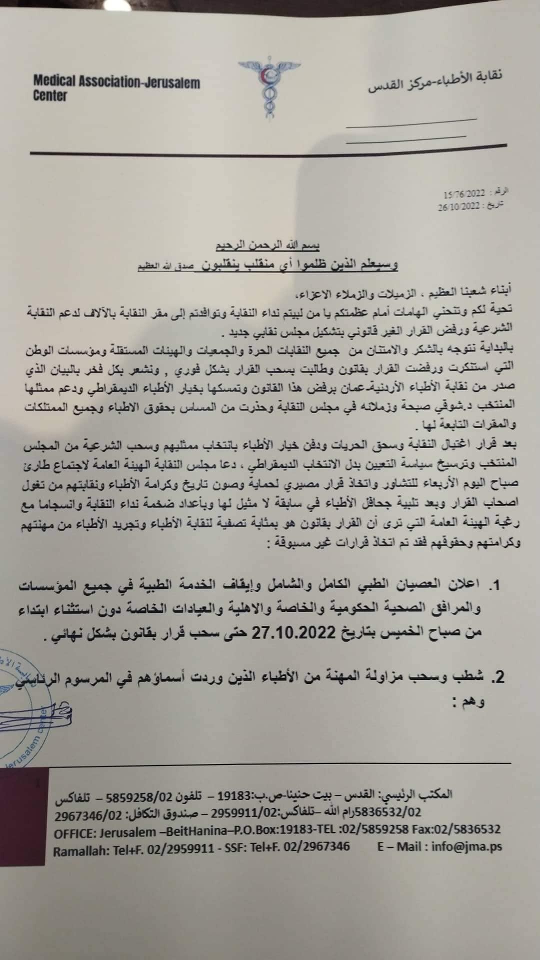 رام الله: أعلنت نقابة الأطباء - مركز القدس في رام الله ، مساء اليوم الأربعاء، العصيان الطبي الكامل، والشامل، وإيقاف الخدمة الطبية في جميع المؤسسات، والمرافق الصحية الحكومية، والخاصة، والأهلية، والعيادات الخاصة، بدءًا من صباح غدٍ الخميس، وذلك حتى سحب قرار بقانون بشكل نهائي، القاضي بإنشاء نقابة أطباء فلسطينية جديدة.