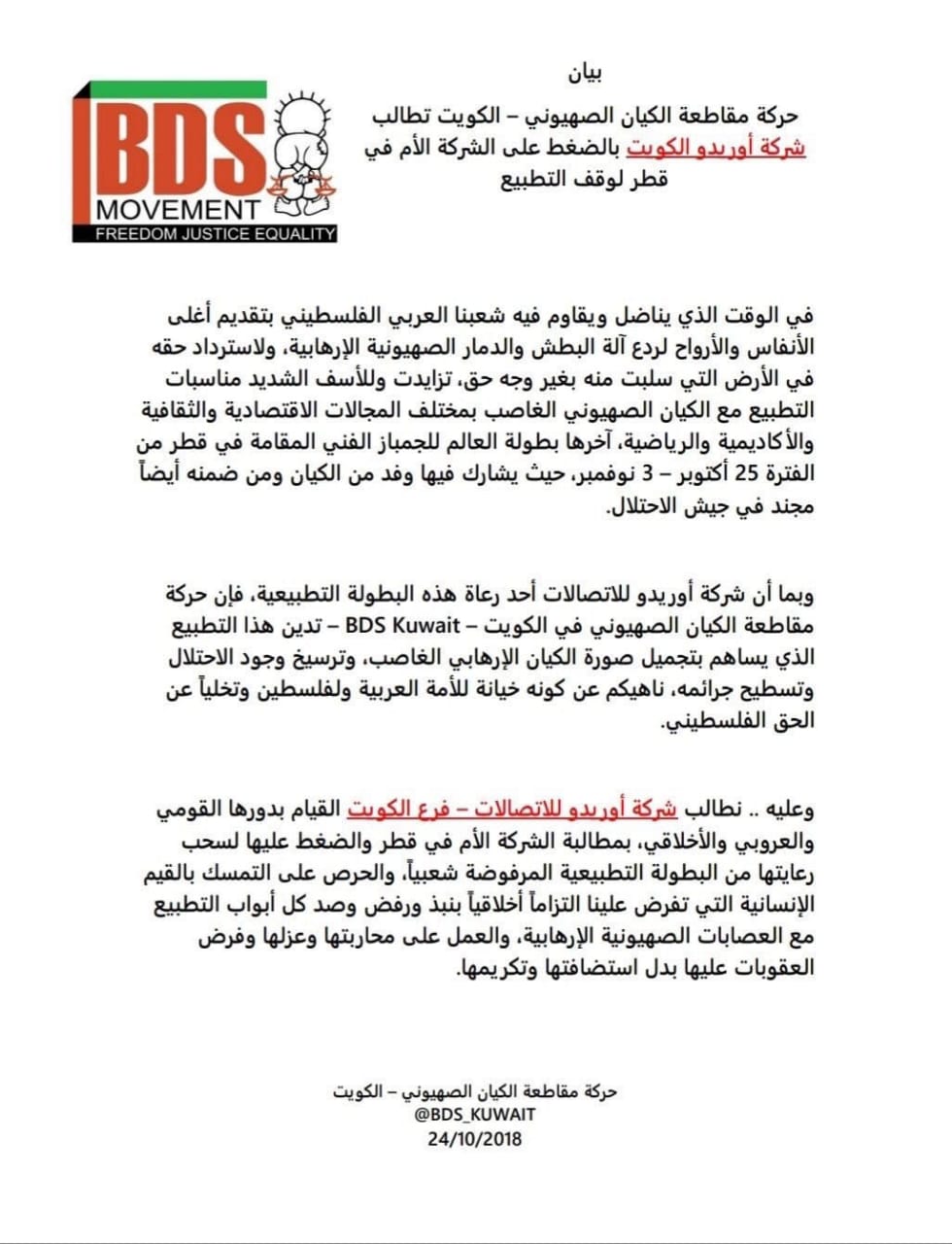 وأكد البيان:" أن شركة أوريدو للاتصالات أحد رعاة هذه البطولة التطبيعية فان الحركة في الكويت تدين هذا التطبيع الذي يساهم بتجميل صورة الكيان الارهابي الغاصب وترسيخ وجود الاحتلال وترسيخ جرائمه، ناهيكم عن كونه خيانة للأمة العربية ولفلسطين وتخليا عن الحق الفلسطيني".