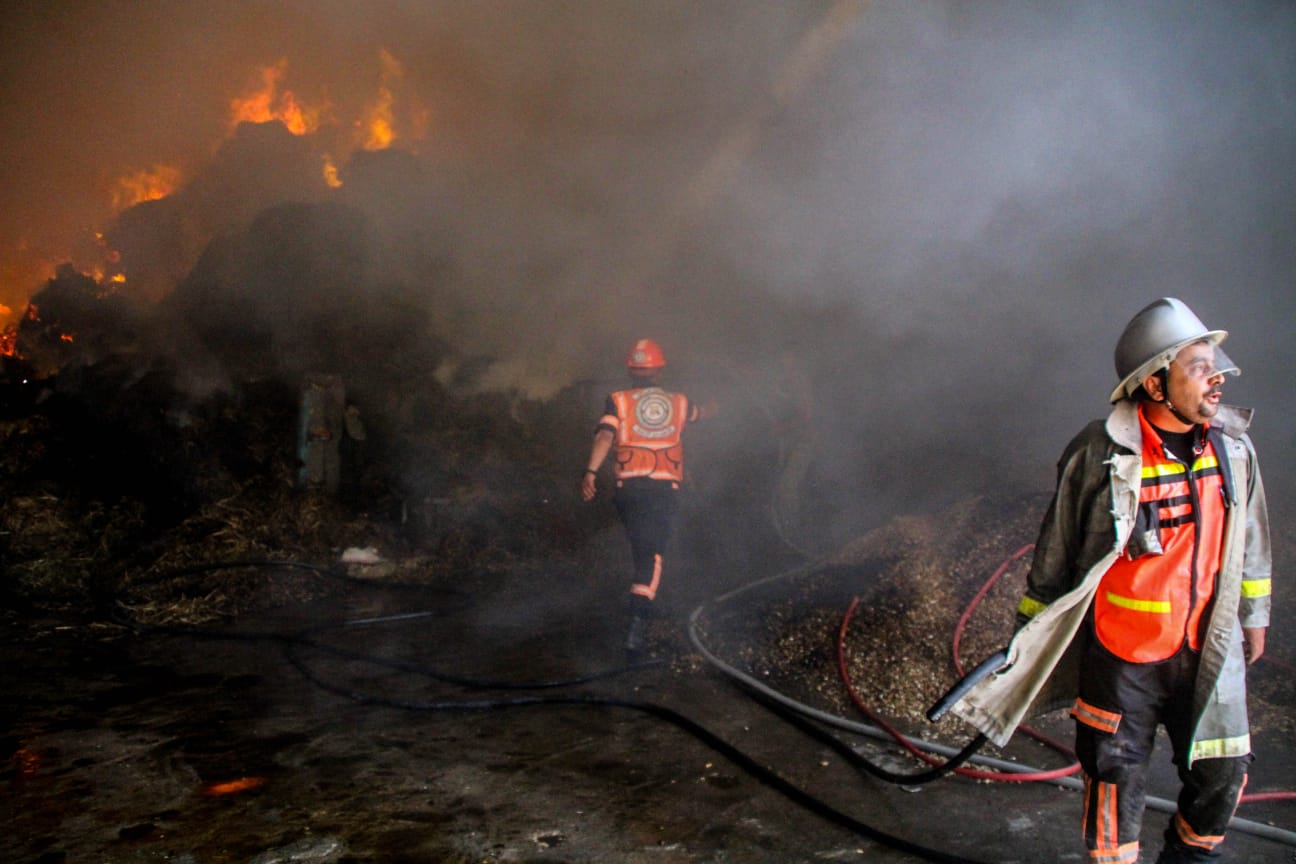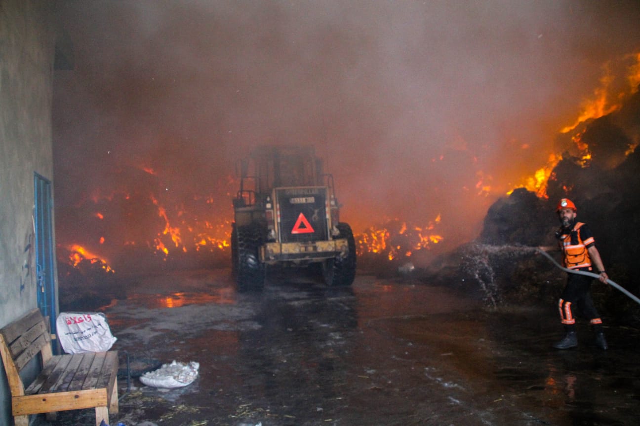بالصور|| الدفاع المدني بغزة: طواقمنا تعمل على إخماد حريق في مخزن للأعلاف شمال القطاع