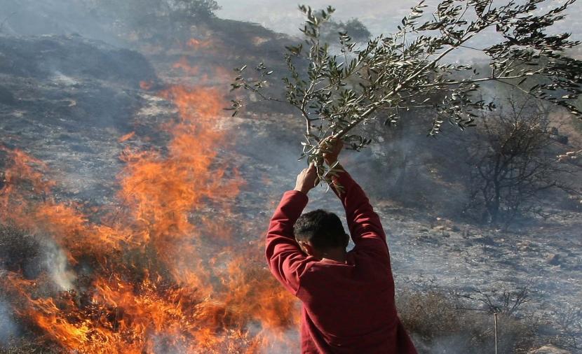 مستوطنون يشعلون النار بأشجار الزيتون في نعلين