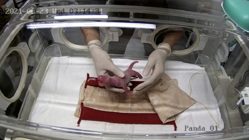 وأوضح، أن جميع العاملين يتعاونون في مراقبة الباندا العملاقة الأم والطفلين وحمايتهم. مشيرًا إلى أن وزن أحد المولودين بلغ 124 غرامًا، ولم يعرف وزن الثاني، ويعادل طول كل منهما طول الكف تقريبًا.