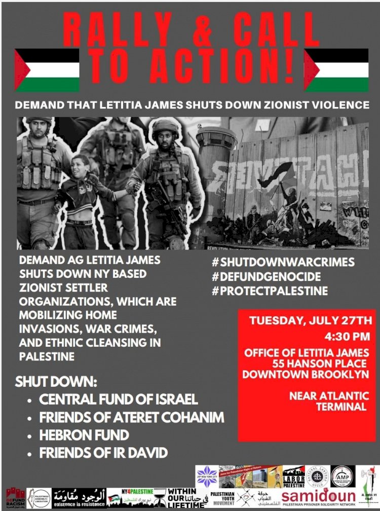 وأوضح التحالف في بيان، أن التظاهرة تهدف للضغط على المدعية العامة جونز لاتخاذ اجراءات بإغلاق ومحاكمة القائمين على أربع منظمات استيطانية تتخذ من مدينة نيويورك مركزا لها، وهي منظمات: الموازنة المركزية لإسرائيل، واصدقاء عطيرات كوهانيم، ومنظمة تمويل البؤرة الاستيطانية في الخليل، ومنظمة اصدقاء ديفيد.