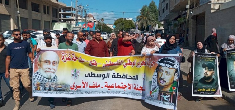 وحمل المشاركون من مكونات اللجنة الاجتماعية في حركة فتح لافتات تُساند الأسرى المضربين عن الطعام، وذلك داخل سجون الاحتلال.