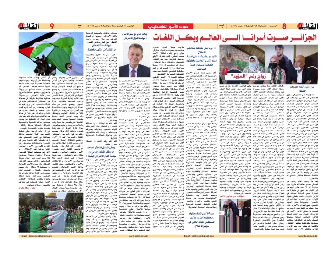 الجزائر: تواصل الصحف الجزائرية عرض قضية أسرانا البواسل، عبر ملاحق أسبوعية مخصصة لعرض مآسي الأسرى في سجون الاحتلال الإسرائيلي.