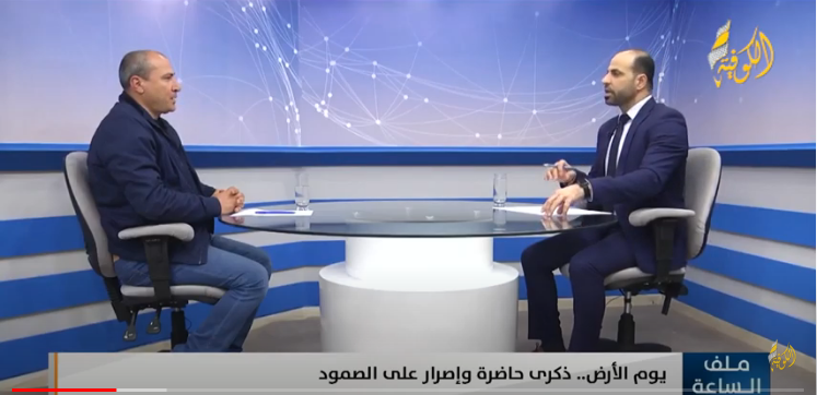 وأضاف في برنامج "ملف الساعة" على شاشة  قناة "الكوفية"، أن هبة يوم الأرض جسدت وحدة الشعب الفلسطيني في الداخل المحتل مع باقي المناطق  الفلسطينية المحتلة، وفضحت الرواية الإسرائيلية الرامية لتصفية الوجود الفلسطيني في الداخل أمام دول العالم أجمع، معتبرا أن يوم الأرض شكل نموذجا وطنيا موحدا بين كل أبناء شعبنا في كل مكان.