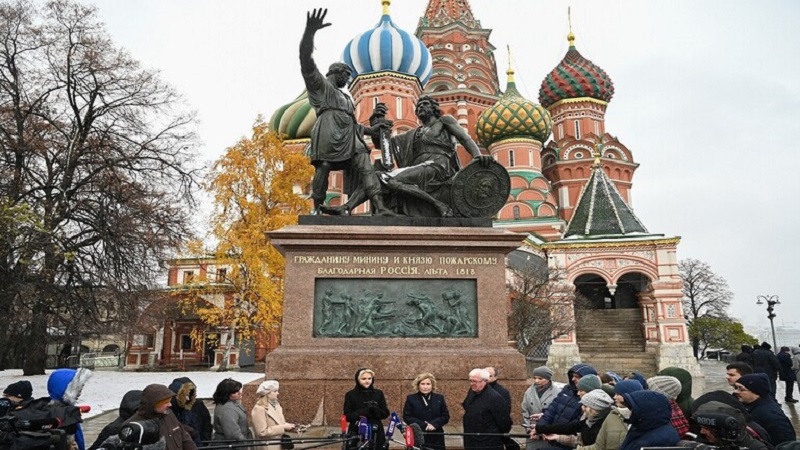 يذكر أن تمثال الأمير القائد دميتري بوجارسكي ومساعده المواطن كوزما مينين نصب في الساحة الحمراء لـ204 أعوام خلت تخليدا للانتصار العظيم على الغزاة البولنديين الذي حققه الشعب الروسي عام 1612 وطردهم من الكرملين وموسكو. وتم إنشاء التمثال البرونزي عام 1818 بتبرعات شعبية ولم يتوقف العمل على إنشائه حتى أثاء الحرب الوطنية عام 1812 ضد نابليون، وأجريت أول عملية ترميم له عام 1931