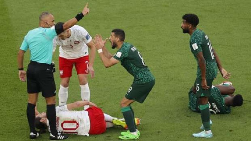 وبعد تقدم بولندا بخمس دقائق وصلت الكرة إلى صالح الشهري داخل منطقة الجزاء وتعرض لتدخل من بيليك لكن الحكم أشار بمواصلة اللعب.