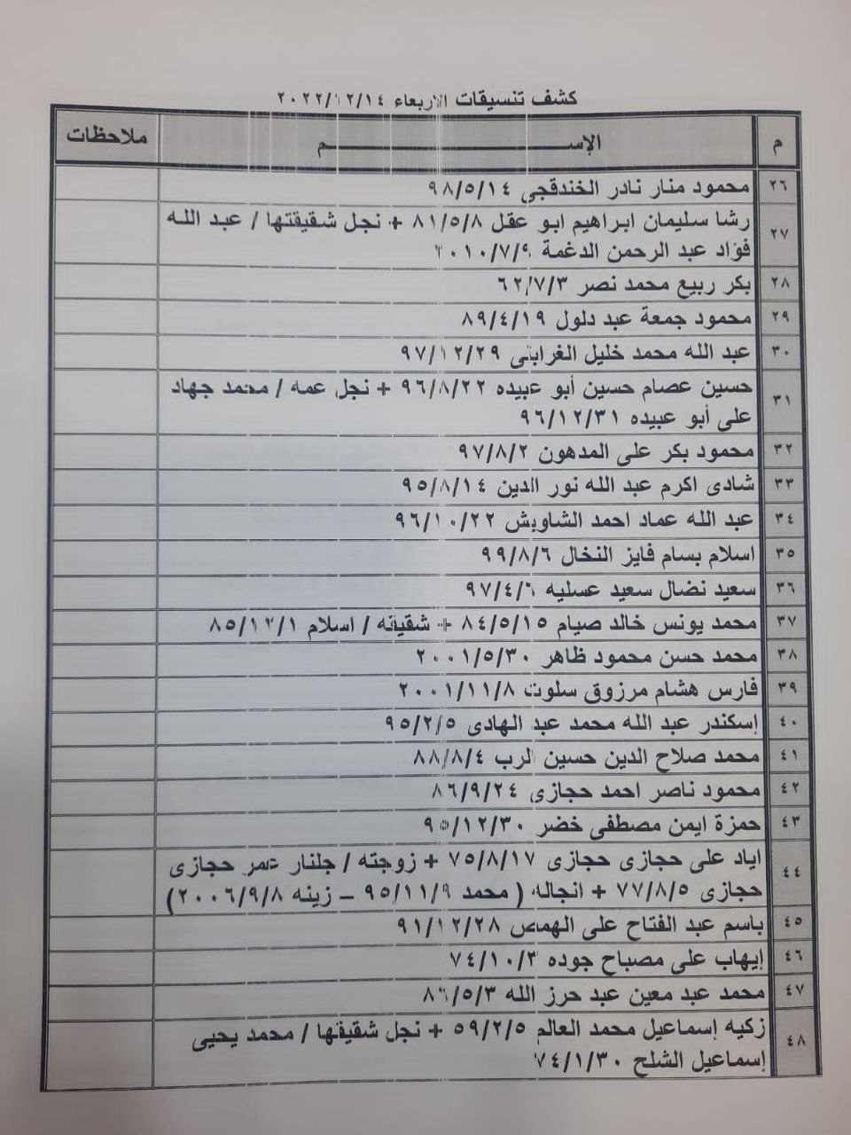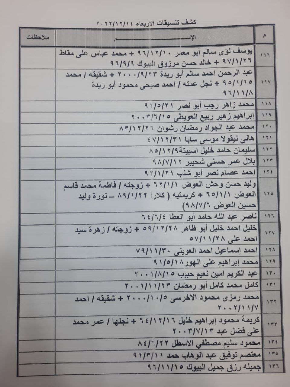 وأعلنت الداخلية، وصول كشف "تنسيقات مصرية" للسفر عبر معبر رفح البري يوم الأربعاء 14 ديسمبر/ كانون الأول والذين عليهم الحضور في تمام السابعة صباحا إلى الصالة الخارجية للمعبر لتسهيل سفرهم.